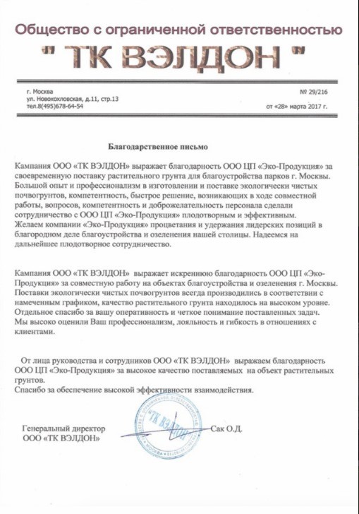 "Компания ООО «ТК ВЭЛДОН» выражает искреннюю благодарность за своевременную работу на объектах благоустройства и озеленения г. Москвы.